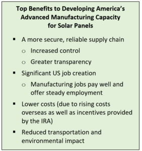 While the consortium is focused on solar manufacturing, wind and energy storage are also critical in reinventing the US energy sector and decarbonizing our economy. We are working proactively to secure our supply chains for both technologies, efforts that include evaluating opportunities to enhance and expand domestic manufacturing capacity in these sectors.
